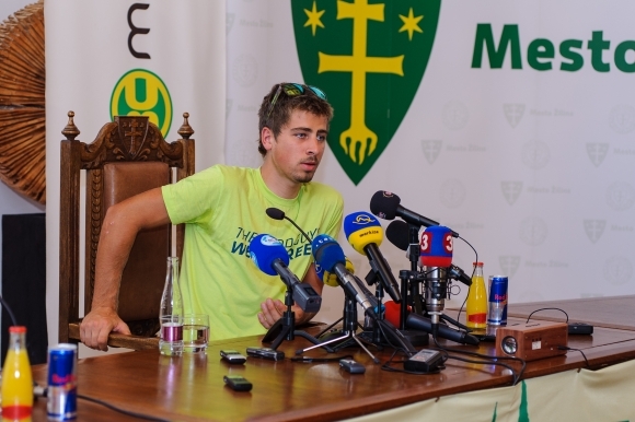 Slovenský cyklista Peter Sagan na tlačovej konferencii odpovedá na otázky novinárov pri príležitosti návštevy rodného mesta Žilina. Žilina, 23. júl 2013. Foto: SITA/Milo Fabian