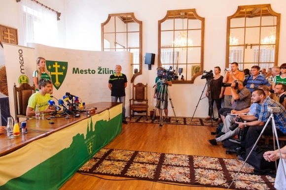Slovenský cyklista Peter Sagan (vľavo v popredí) na tlačovej konferencii odpovedá na otázky novinárov pri príležitosti návštevy rodného mesta Žilina. Žilina, 23. júl 2013. Foto: SITA/Milo Fabian