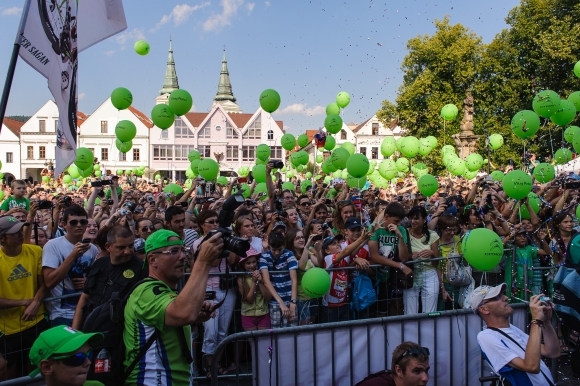 Slovenský cyklista Peter Sagan zdraví obyvateľov mesta Žilina na Mariánskom námestí. Žilina, 23. júl 2013. Foto: SITA/Milo Fabian