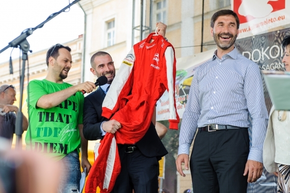 Generálny riaditeľ Citroën Slovakia Marc Bénier (druhý sprava) a predseda ŽSK Juraj Blanár (vpravo) počas odovzdávania dresu francúzskeho rally jazdca Sébastiena Loeba pri príležitosti stretnutia cyklistu Petra Sagana s obyvateľmi mesta Žilina na Mariánskom námestí. Žilina, 23. júl 2013. Foto: SITA/Milo Fabian
