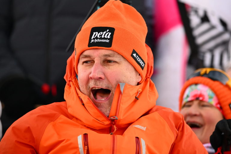 Zľava: Tréner Petry Vlhovej Mauro Pini a manažér Petry Vlhovej Richard Galovič počas brífingu po skončení obrovského slalomu žien, na ktorom ohlásil koniec sezóny slovenskej lyžiarky Petry Vlhovej kvôli zraneniu v rámci pretekov Svetového pohára v alpskom lyžovaní v lyžiarskom stredisku Jasná v Demänovskej doline. Demänovská Dolina, 20. január 2024. Foto: SITA/Martin Medňanský.