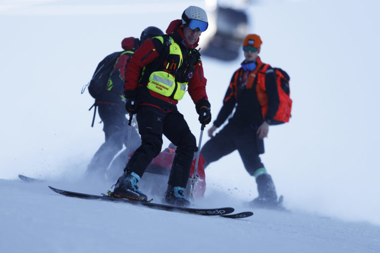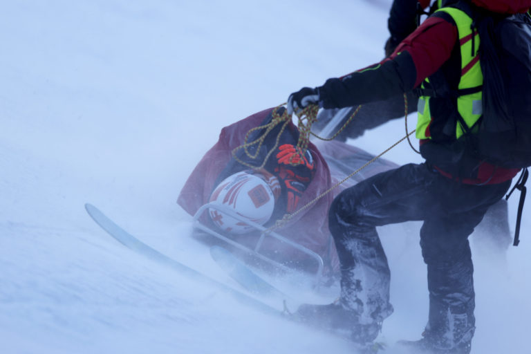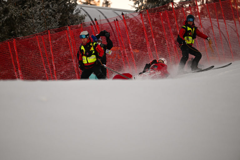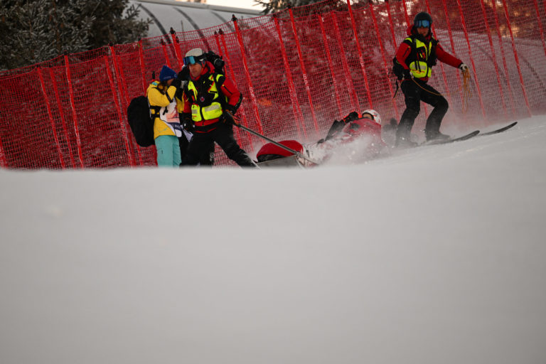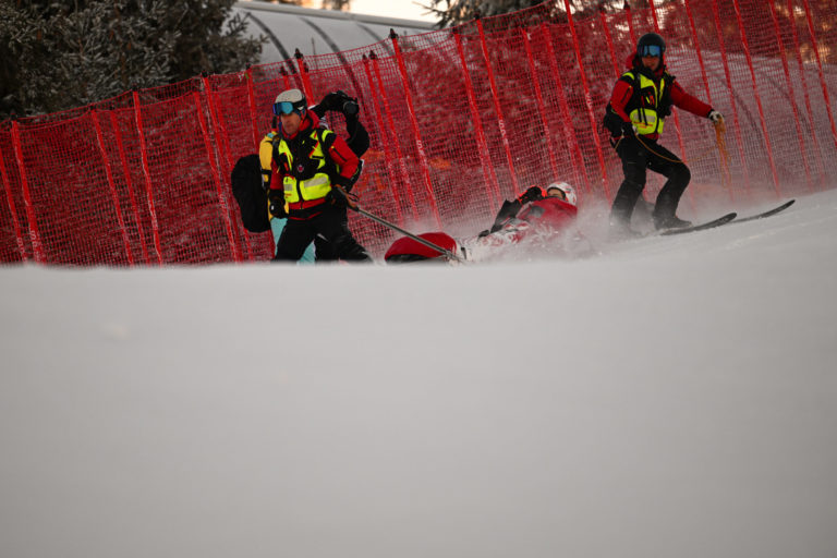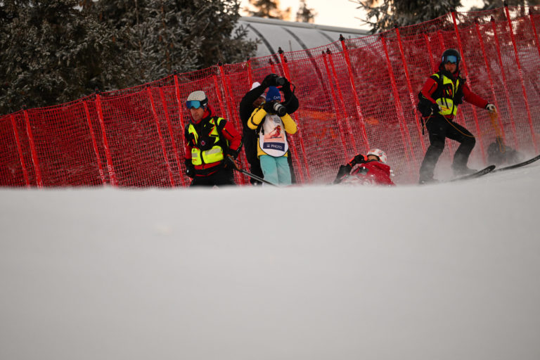 Slovenská zjazdová lyžiarka Petra Vlhová (druhá sprava) po páde počas 1. kola obrovského slalomu žien v rámci pretekov Svetového pohára v alpskom lyžovaní v lyžiarskom stredisku Jasná v Demänovskej Slovenská lyžiarka Petra Vlhová po páde v prvom kole obrovského slalomu v Jasnej. Jasná, 20. január 2024. Foto: SITA/Martin Medňanský.