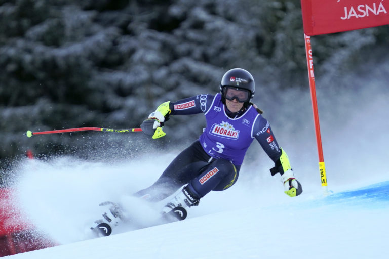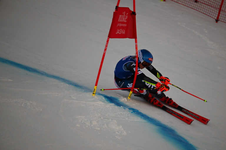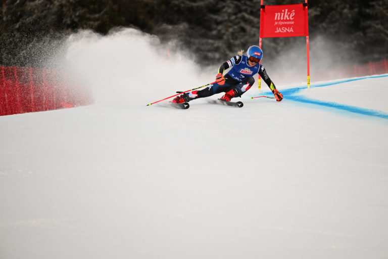 Američanka Mikaela Shiffrinová počas prvého kola obrovského slalomu Svetového pohára 2023/2024 v Jasnej (20. január 2024). Foto: SITA/AP.