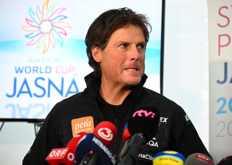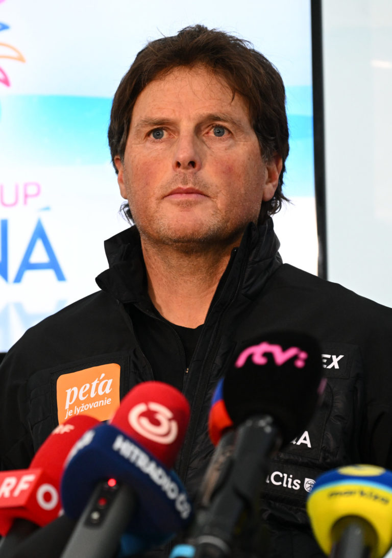 Tréner Petry Vlhovej Mauro Pini počas brífingu po skončení obrovského slalomu žien, na ktorom ohlásil koniec sezóny slovenskej lyžiarky Petry Vlhovej kvôli zraneniu v rámci pretekov Svetového pohára v alpskom lyžovaní v lyžiarskom stredisku Jasná v Demänovskej doline. Demänovská Dolina, 20. január 2024. Foto: SITA/Martin Medňanský.
