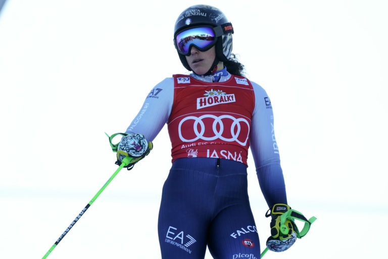 Talianka Federica Brignoneová po vypadnutí v prvom kole obrovského slalomu Svetového pohára 2023/2024 v Jasnej (20. január 2024). Foto: SITA/AP.