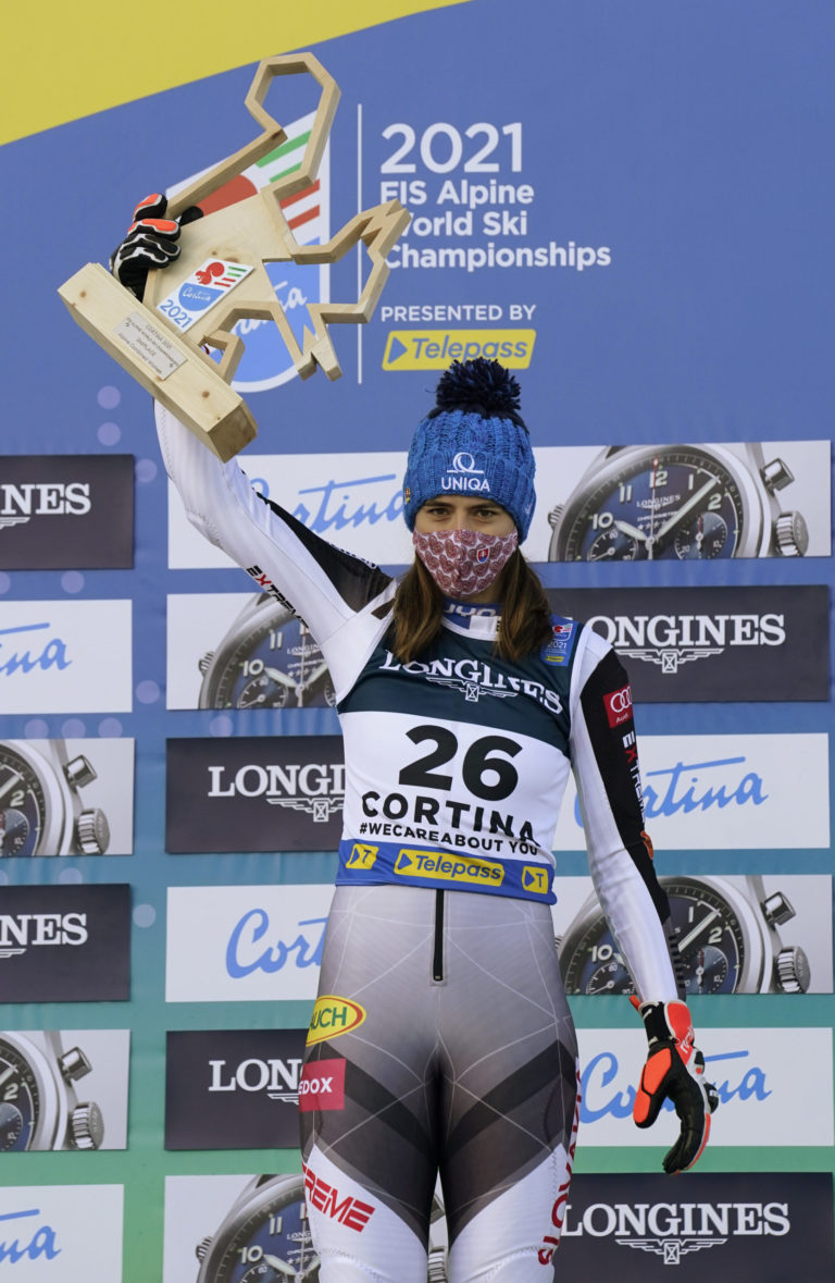 Slovenská reprezentantka Petra Vlhová na stupňoch pre víťazky po jej druhom mieste v alpskej kombinácii na MS v zjazdovom lyžovaní. Cortina d'Ampezzo, 15. február 2021. Foto: SITA/AP.