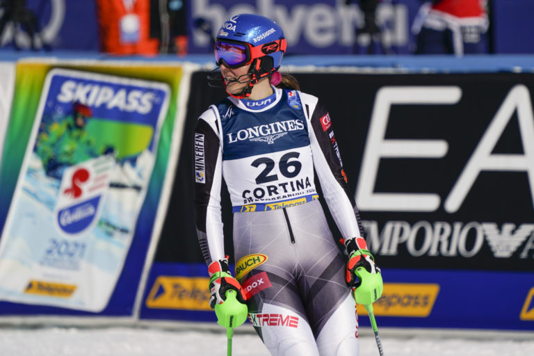 Slovenská reprezentantka Petra Vlhová v cieli slalomu v rámci alpskej kombinácie žien na MS v zjazdovom lyžovaní. Cortina d'Ampezzo, 15. február 2021. Foto: SITA/AP.