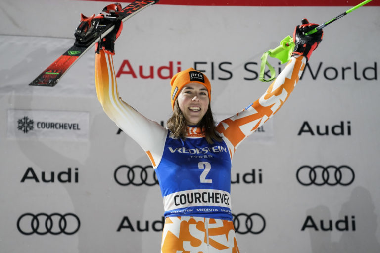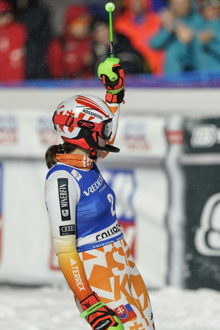 Slovenská lyžiarka Petra Vlhová sa teší z triumfu v nočnom slalome vo francúzskom Courcheveli. Courchevel, 21. december 2023. Foto: SITA/AP.