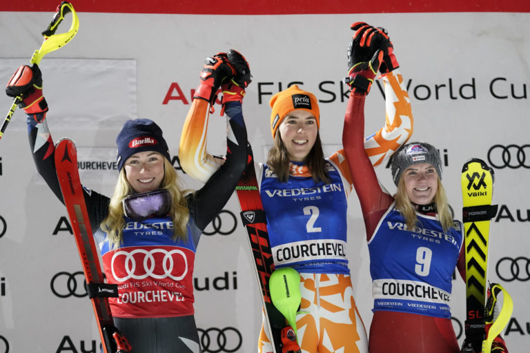 Víťazka nočného slalomu vo francúzskom Courcheveli Petra Vlhová (uprostred), strieborná Američanka Mikaela Shiffrinová a bronzová Rakúšanka Katharina Truppeová. Courchevel, 21. december 2023. Foto: SITA/AP.