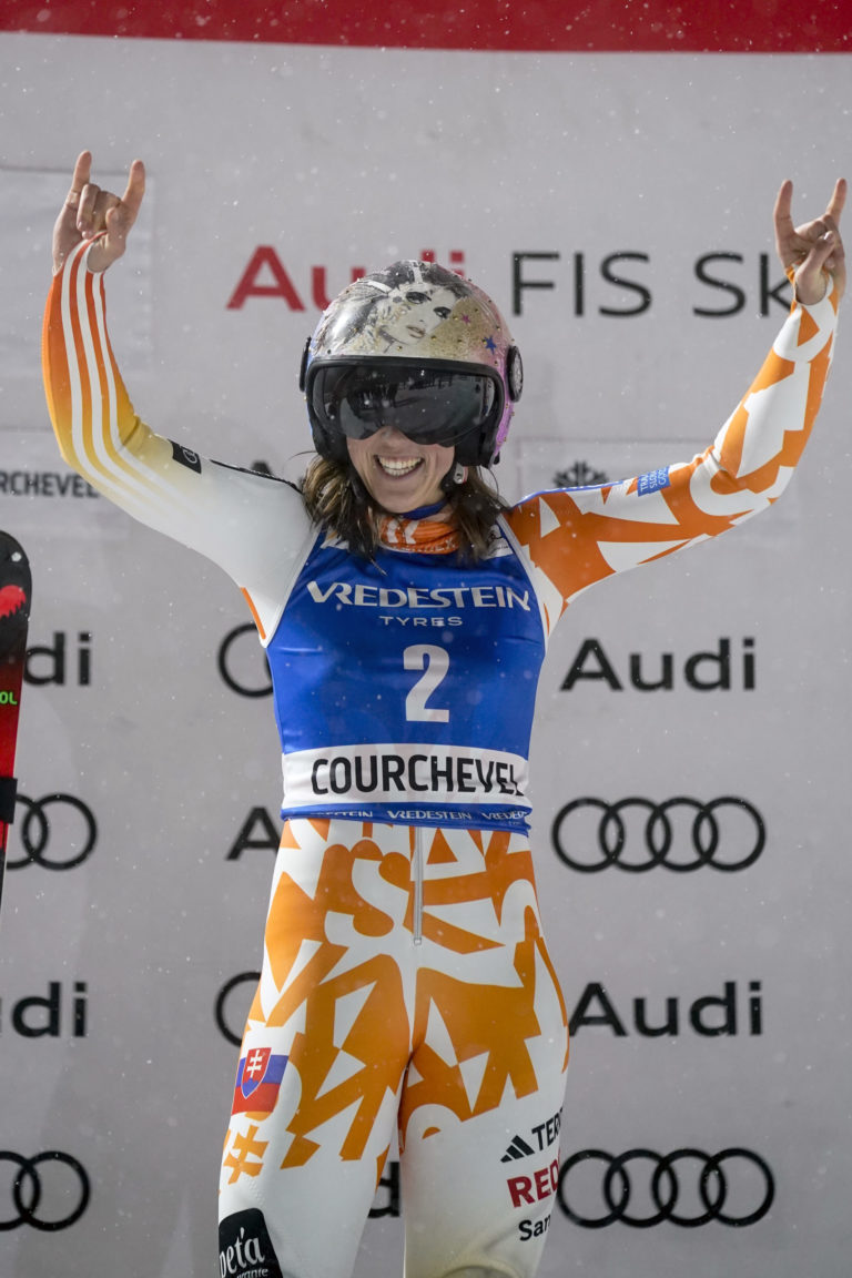 Slovenská lyžiarka Petra Vlhová na stupňoch pre víťazky po jej triumfe v nočnom slalome vo francúzskom Courcheveli. Courchevel, 21. december 2023. Foto: SITA/AP.
