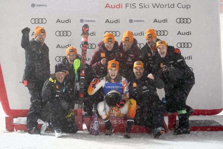 Slovenská lyžiarka Petra Vlhová s tímom po jej triumfe v nočnom slalome vo francúzskom Courcheveli. Courchevel, 21. december 2023. Foto: SITA/AP.