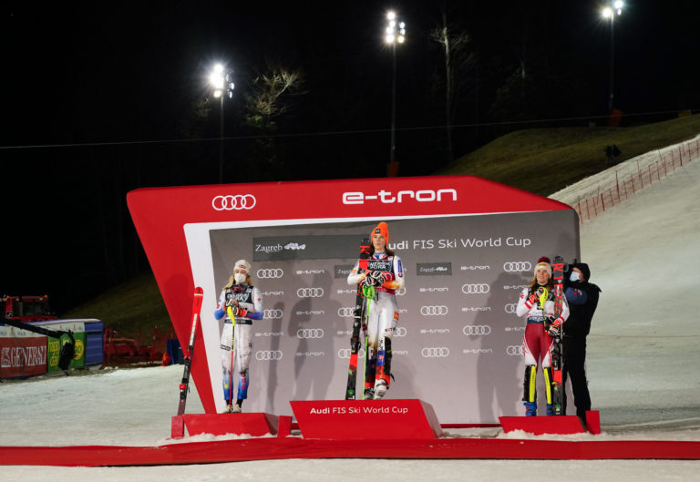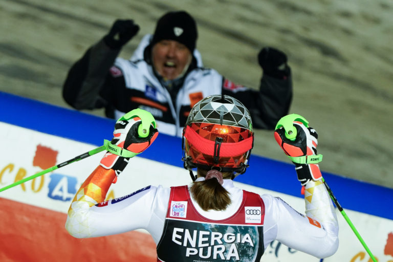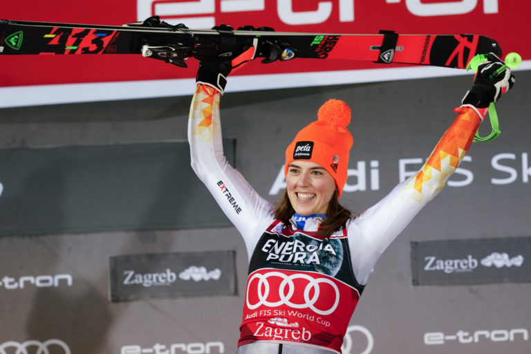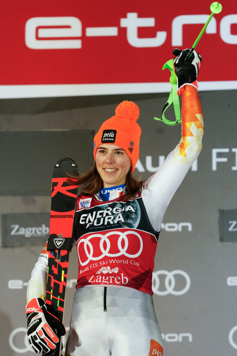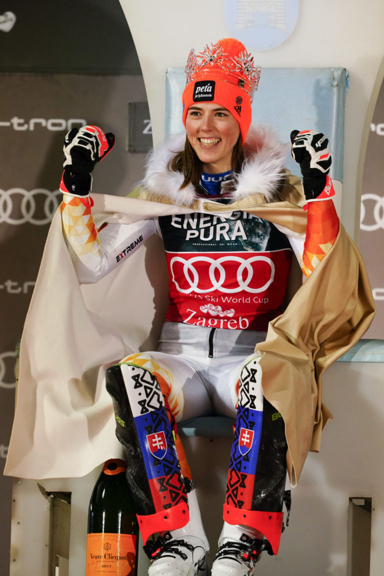 Slovenská lyžiarka Petra Vlhová oslavuje víťazstvo v pretekoch slalomu Svetového pohára v zjazdovom lyžovaní v Záhrebe. Foto: SITA/AP.