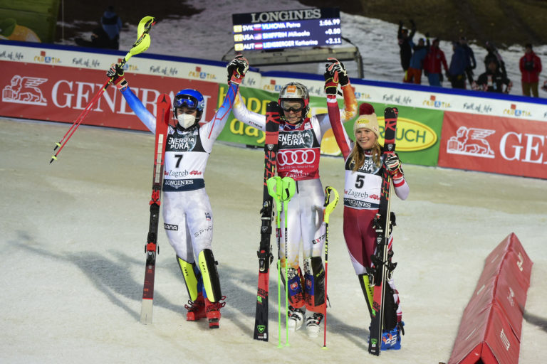 Zľava: Mikaela Shiffrinová, Petra Vlhová a Rakúšanka Katharina Liensbergerová. Foto: SITA/AP.