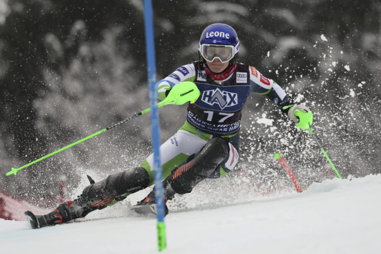 Slovinská lyžiarka Andreja Slokarová počas prvého kola nedeľňajšieho slalomu v Kranjskej Gore. Kranjska Gora, 7. január 2024. Foto: SITA/AP.
