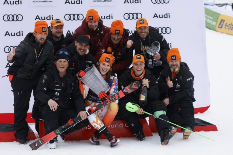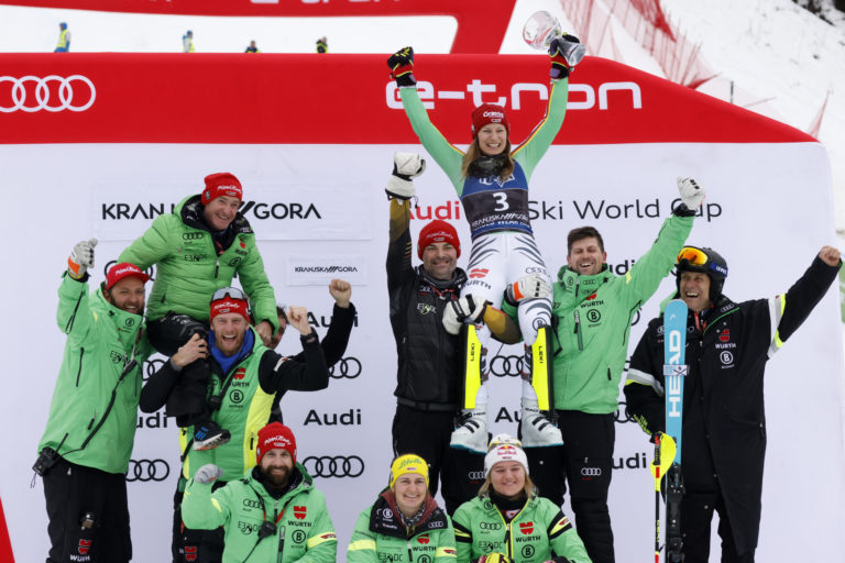 Slovenská lyžiarka Petra Vlhová sa spolu s tímom teší zo svojho triumfu v nedeľňajšom slalome v Kranjskej Gore. Kranjska Gora, 7. január 2024. Foto: SITA/AP.