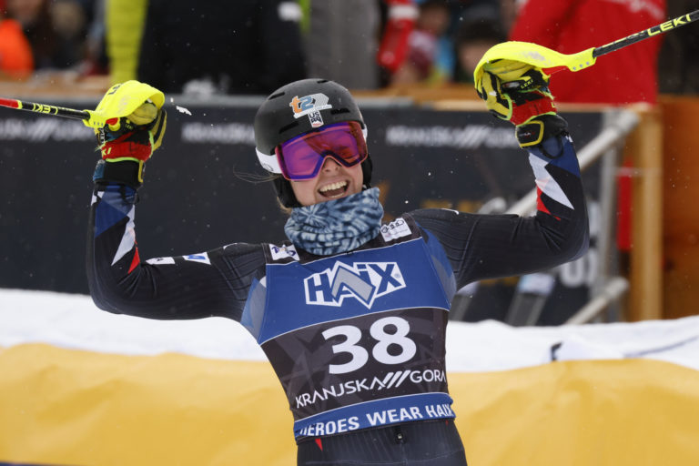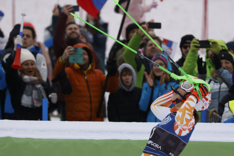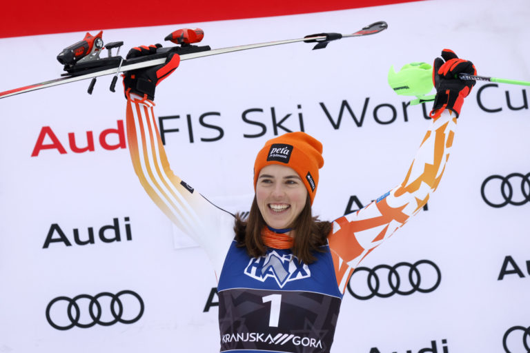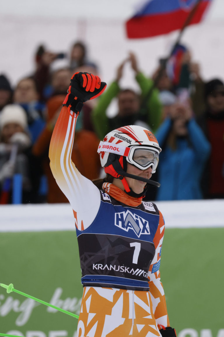 Slovenská lyžiarka Petra Vlhová sa teší z triumfu v nedeľňajšom slalome v Kranjskej Gore. Kranjska Gora, 7. január 2024. Foto: SITA/AP.