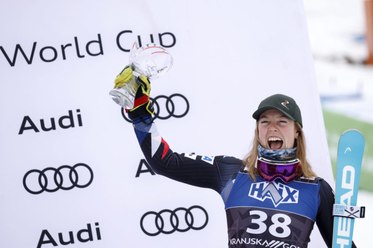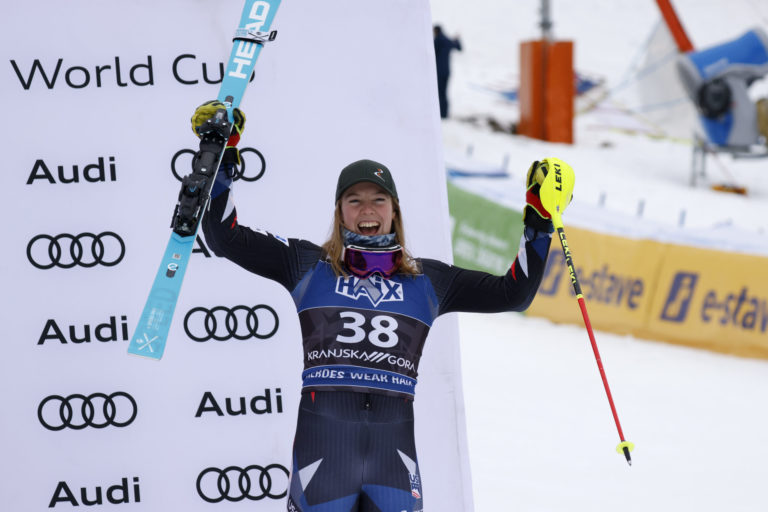 Americká lyžiarka A.J. Hurt v cieli druhého kola slalomu v Kranjskej Gore. Kranjska Gora, 7. január 2024. Foto: SITA/AP.