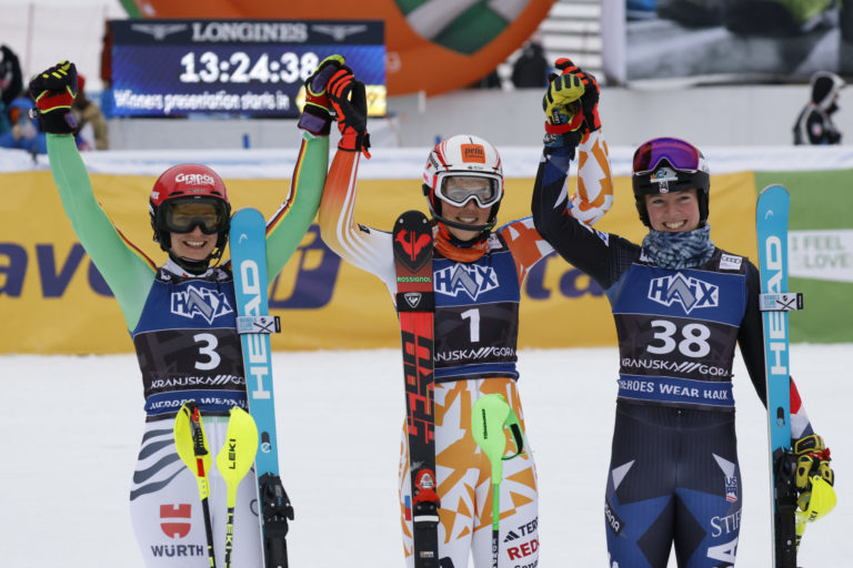 Víťazka nedeľňajšieho slalomu v Kranjskej Gore, Petra Vlhová (uprostred), strieborná Lena Dürrová (vľavo) a bronzová A.J. Hurtová (vpravo). Kranjska Gora, 7. január 2024. Foto: SITA/AP.
