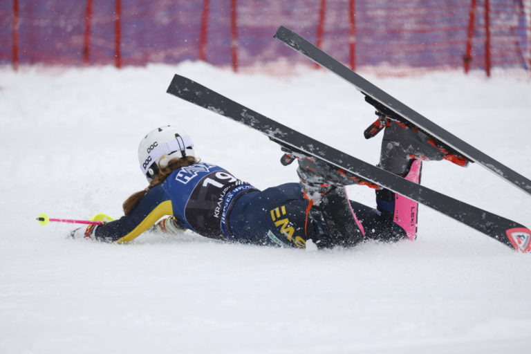 Pád Švédky Hanny Aronssonovej Elfmanovej v prvom kole nedeľňajšieho slalomu v Kranjskej Gore. Kranjska Gora, 7. január 2024. Foto: SITA/AP.