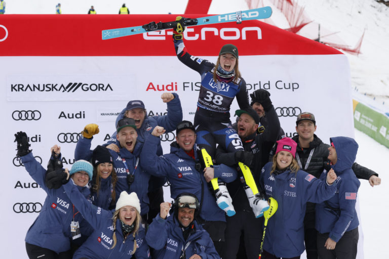 Americká lyžiarka A.J. Hurtová sa spolu s tímom teší zo svojho tretieho miesta v nedeľňajšom slalome v Kranjskej Gore. Kranjska Gora, 7. január 2024. Foto: SITA/AP.