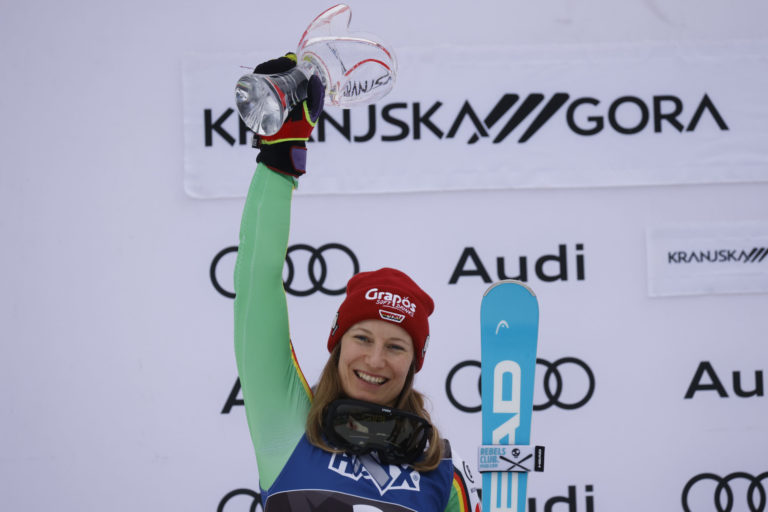 Slovenská lyžiarka Petra Vlhová a Nemka Lena Dürrová po medailovom ceremoniály po nedeľňajšom slalome v Kranjskej Gore. Kranjska Gora, 7. január 2024. Foto: SITA/AP.