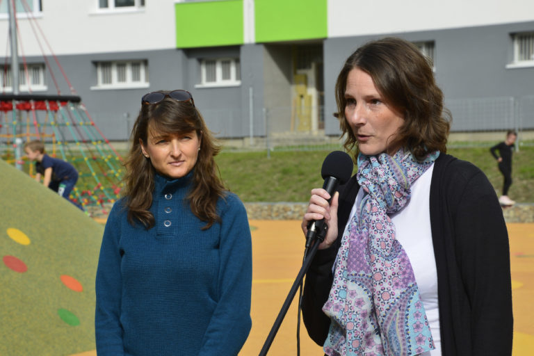 Zľava: Anna Všetečková, zastupujúca okolité rodiny a iniciatorka projektu, Lýdia Ovečková, poslankyňa miestneho zastupiteľstva v Petržalke počas oficiálneho otvorenia športoviska JAMA.