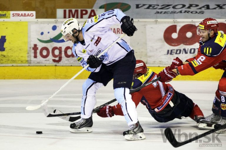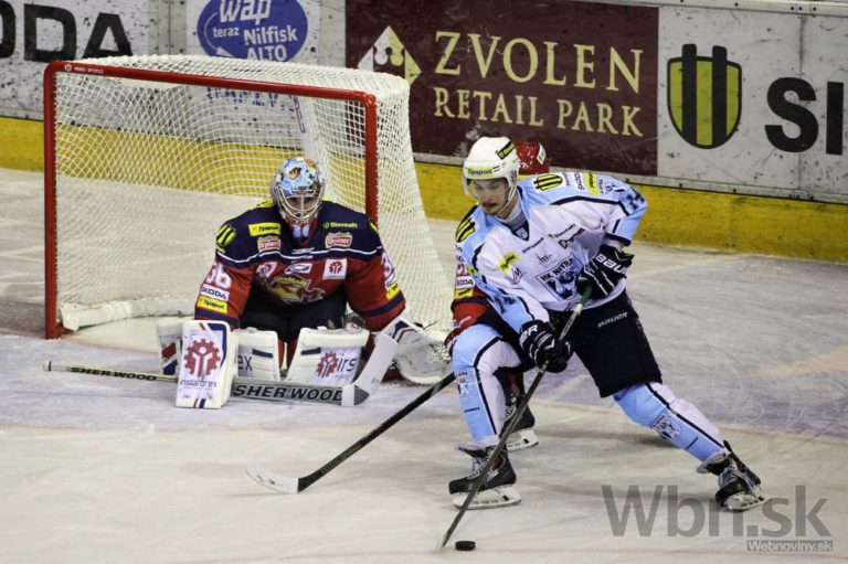 Matej Síkela (vľavo) z HKM Zvolen počas zápasu 5. kola hokejovej Tipsport extraligy medzi HKM Zvolen - HK Nitra. Zvolen, 21. september 2014. Foto: SITA/Ján Viazanička