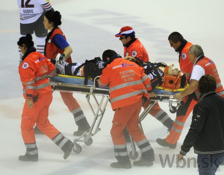 Zranený Ladislav Zikmund z Košíc je odvážaný na nosidlách počas zápasu 5. kola hokejovej Tipsport extraligy medzi HC Košice - HC'05 Banská Bystrica. Košice, 21. február 2014. Foto: SITA/Ivan Fleischer