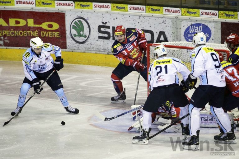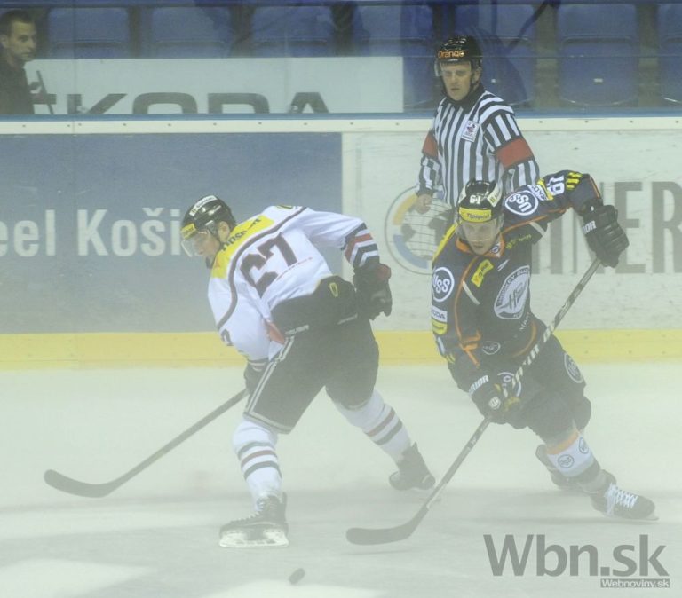 Zľava: Peter Lunter z Banskej Bystrice a Marek Bartánus z Košíc počas zápasu 5. kola hokejovej Tipsport extraligy medzi HC Košice - HC'05 Banská Bystrica. Košice, 21. február 2014. Foto: SITA/Ivan Fleischer