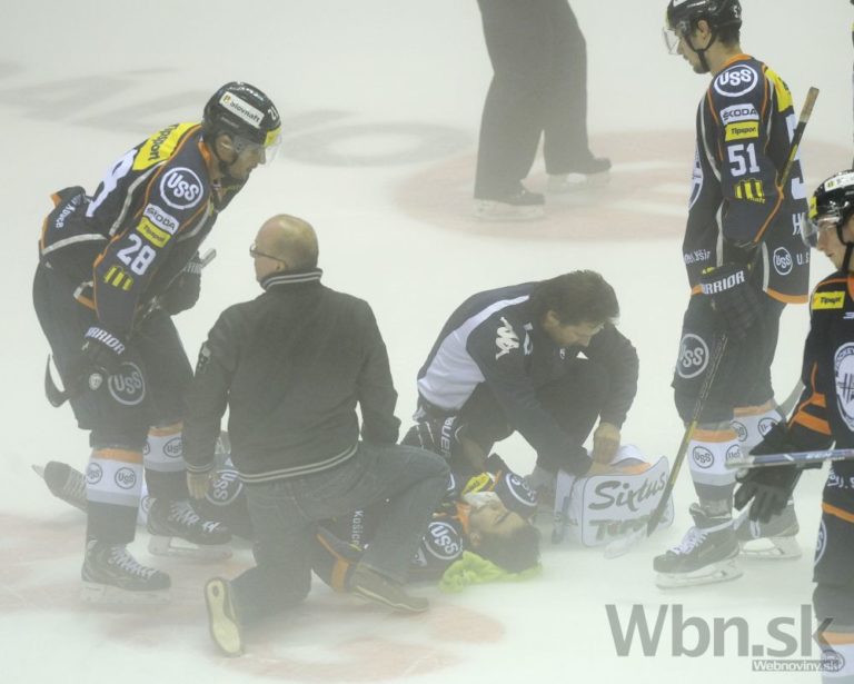 Zranený Ladislav Zikmund z Košíc leží na ľade počas zápasu 5. kola hokejovej Tipsport extraligy medzi HC Košice - HC'05 Banská Bystrica. Košice, 21. február 2014. Foto: SITA/Ivan Fleischer
