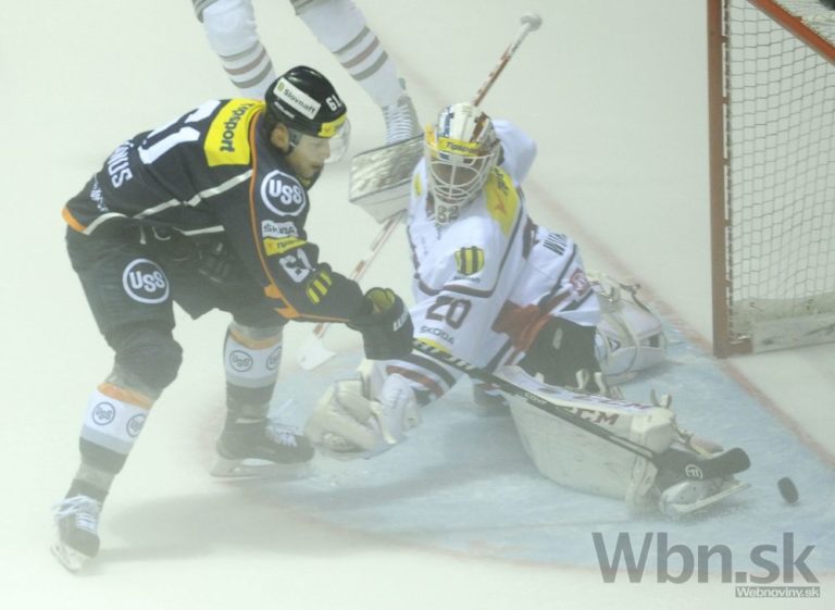 Zľava: Marek Bartánus z Košíc a Miika Wiikman z Banskej Bystrice počas zápasu 5. kola hokejovej Tipsport extraligy medzi HC Košice - HC'05 Banská Bystrica. Košice, 21. február 2014. Foto: SITA/Ivan Fleischer