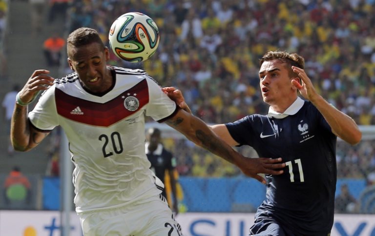 Nemec Jerome Boateng v súboji s Francúzom Antoinem Griezmannom počas štvrťfinálového zápasu na MS v Brazílii. Foto: SITA/AP