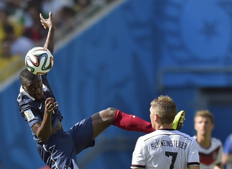Francúz Blaise Matuidi hlavičkuje počas štvrťfinálového zápasu na MS v Brazílii proti Nemecku. Foto: SITA/AP