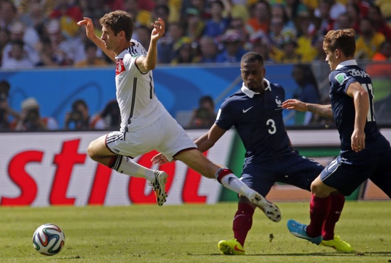 Faulovaný hráč Nemecka Thomas Mueller počas štvrťfinálového zápasu na MS v Brazílii proti Francúzsku. Foto: SITA/AP