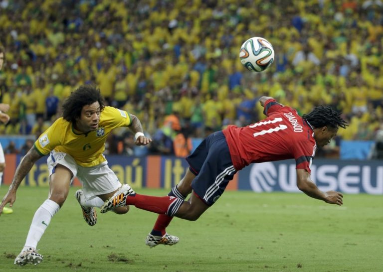 Brazílčan Marcelo v súboji s kolumbijským futbalistom Juanom Cuadradom počas piatkového štvrťfinálového zápasu na svetovom šampionáte. Foto: SITA/AP