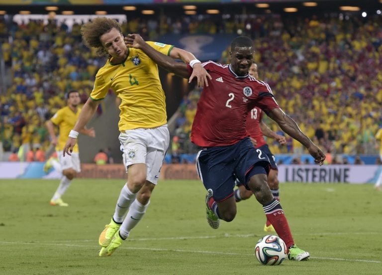 Brazílčan David Luiz v súboji s kolumbijským futbalistom Juanom Cuadradom počas piatkového štvrťfinálového zápasu na svetovom šampionáte v Brazílii. Foto: SITA/AP