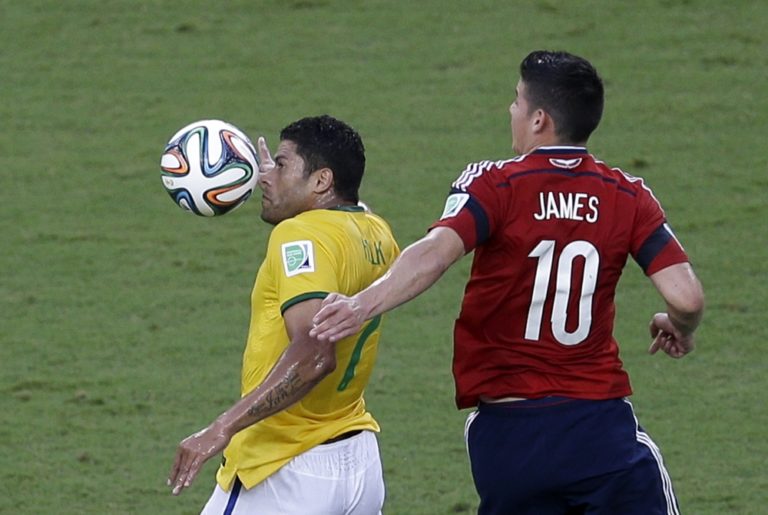 Brazílčan Hulk v súboji s kolumbijským futbalistom Jamesom Rodriguezom počas piatkového štvrťfinálového zápasu na svetovom šampionáte. Foto: SITA/AP