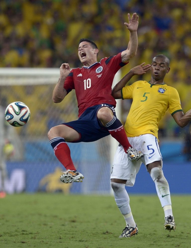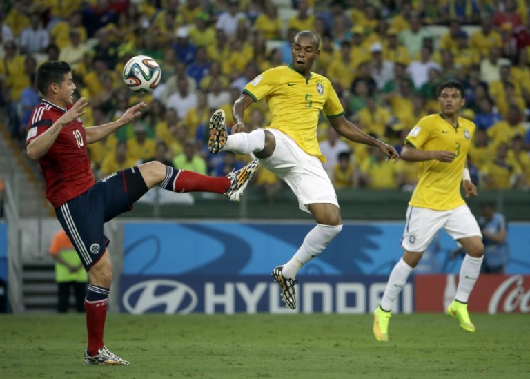 Brazílčan Fernandinho v súboji s kolumbijským futbalistom Jamesom Rodriguezom počas piatkového štvrťfinálového zápasu na svetovom šampionáte v Brazílii. Foto: SITA/AP