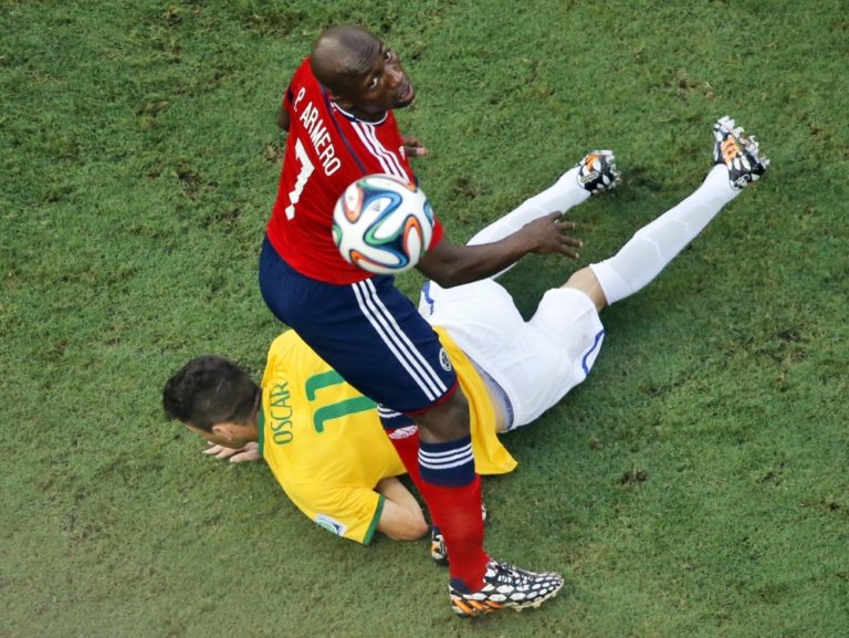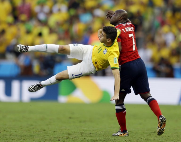 Brazílčan Oscar padá po súboji s kolumbijským futbalistom Pablom Armerom počas piatkového štvrťfinálového zápasu na svetovom šampionáte. Foto: SITA/AP