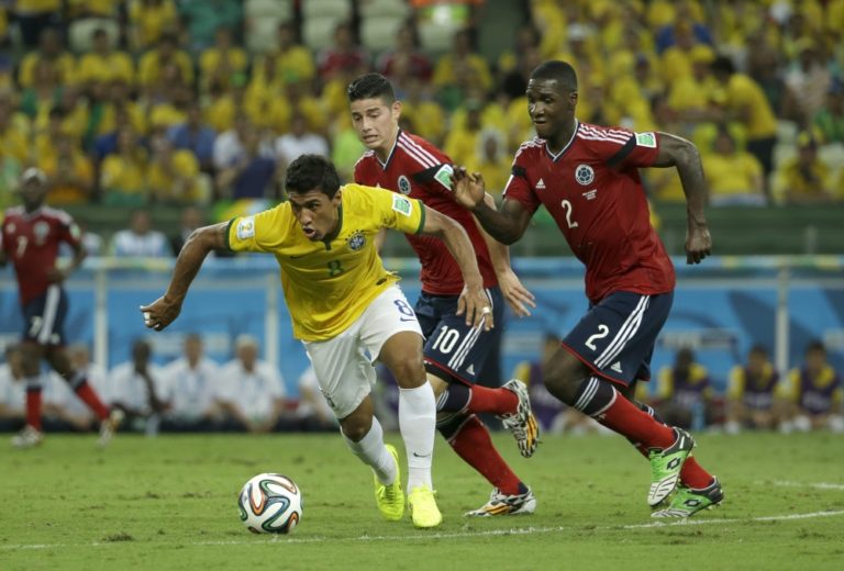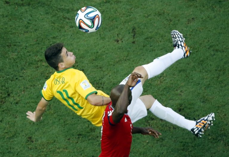Brazílčan Oscar v súboji s kolumbijským futbalistom Carlosom Sanchezom Morenom počas piatkového štvrťfinálového zápasu na svetovom šampionáte. Foto: SITA/AP