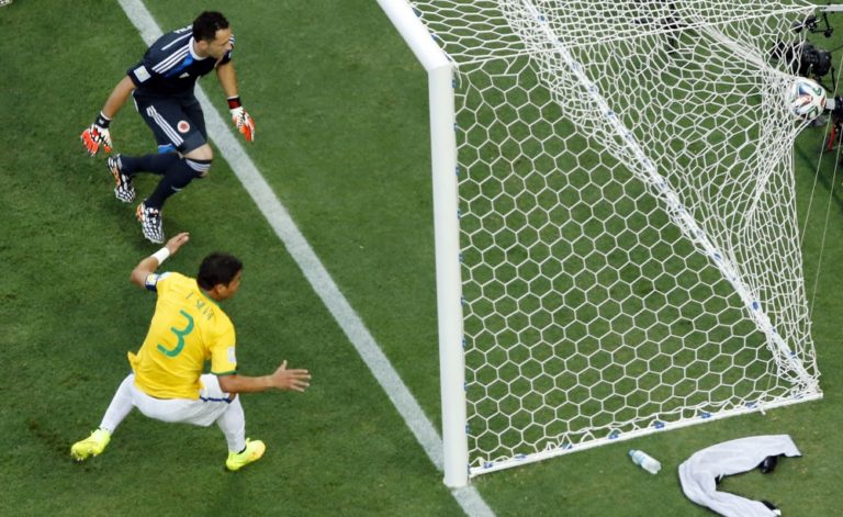 Lopta po strela Brazílčana Davida Luiza končí v sieti kolumbijského brankára Davida Ospinu počas piatkového štvrťfinálového zápasu na svetovom šampionáte v Brazílii. Foto: SITA/AP