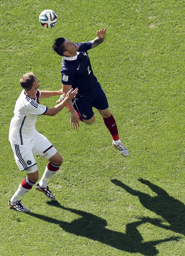 Francúz Mathieu Debuchy v súboji s nemeckým futbalistom Benediktom Höwedesom počas piatkového štvrťfinálového zápasu na svetovom šampionáte v Brazílii. Foto: SITA/AP
