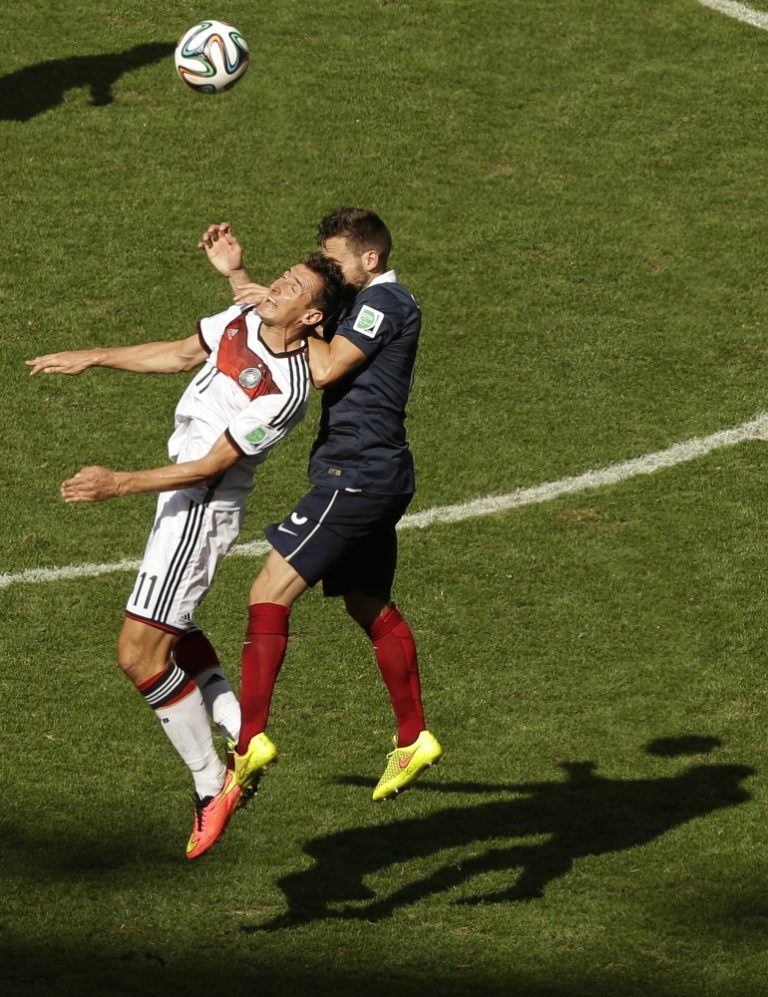 Francúz Mamadou Sakho v súboji s nemeckým futbalistom Miroslavom Klosem počas piatkového štvrťfinálového zápasu na svetovom šampionáte v Brazílii. Foto: SITA/AP