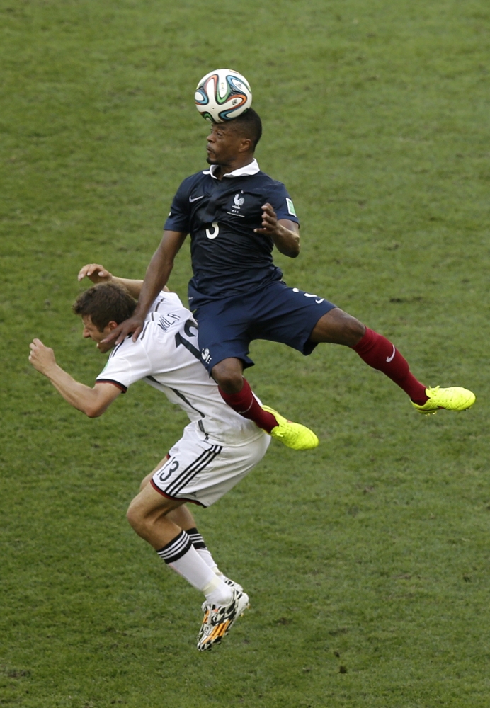 Francúz Patrice Evra v súboji s nemeckým futbalistom Thomasom Müllerom počas piatkového štvrťfinálového zápasu na svetovom šampionáte v Brazílii. Foto: SITA/AP