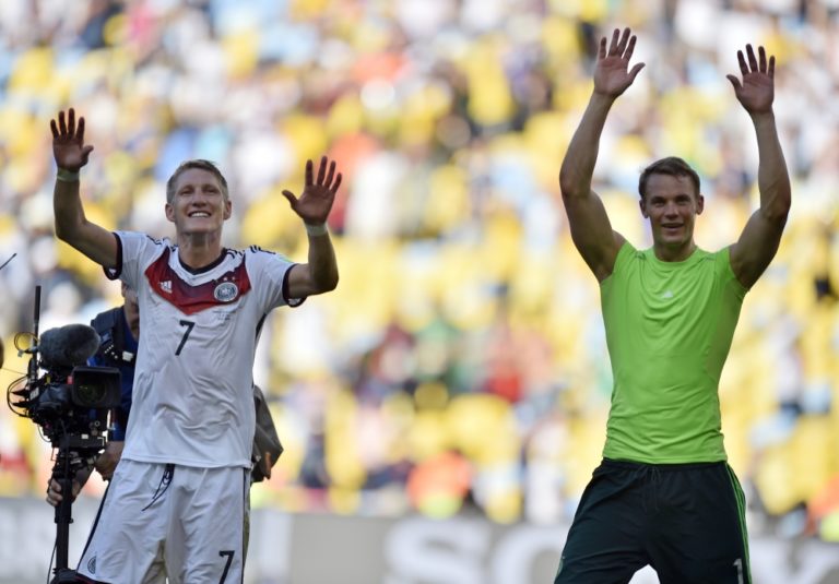Radosť Nemcov Bastiana Schweinsteigera a Manuela Neuera po štvrťfinálovom zápase na MS v Brazílii proti Francúzsku. Foto: SITA/AP