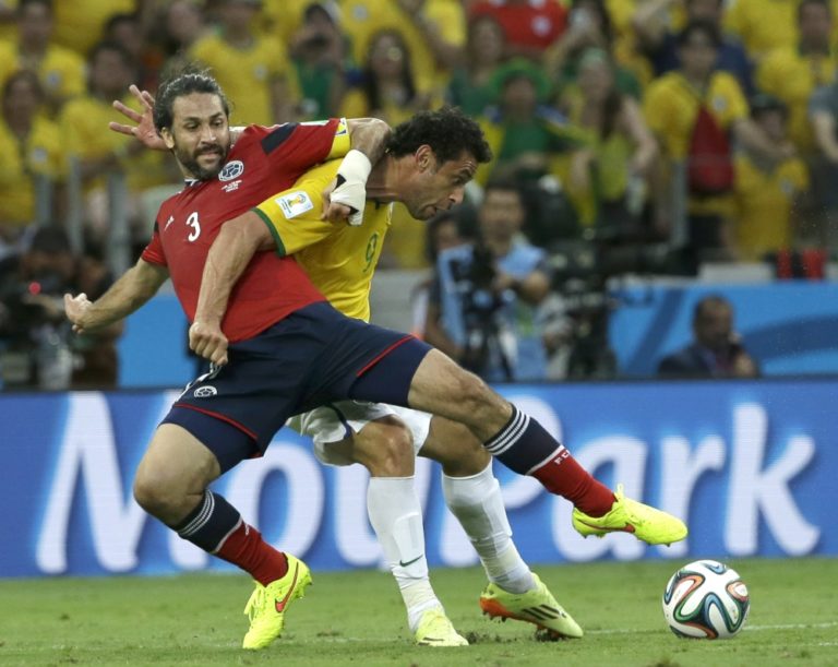 Brazílčan Fred v súboji s kolumbijským futbalistom Mariom Yepesom počas piatkového štvrťfinálového zápasu na svetovom šampionáte. Foto: SITA/AP
