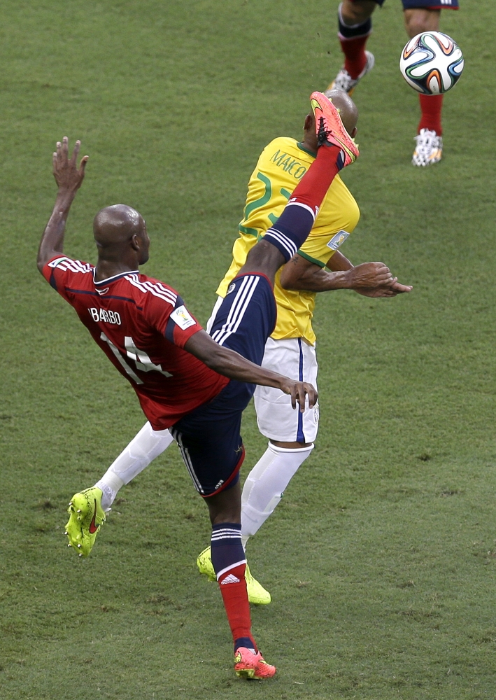 Brazílčan Maicon v súboji s kolumbijským futbalistom Victorom Ibarbom počas piatkového štvrťfinálového zápasu na svetovom šampionáte v Brazílii. Foto: SITA/AP
