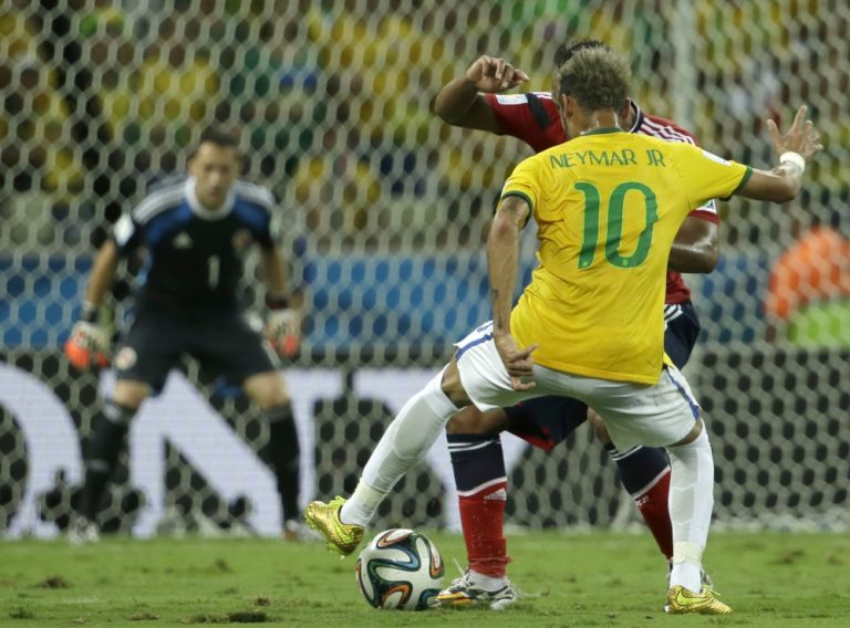 Brazílčan Neymar v súboji s kolumbijským futbalistom počas piatkového štvrťfinálového zápasu na svetovom šampionáte v Brazílii. Foto: SITA/AP
