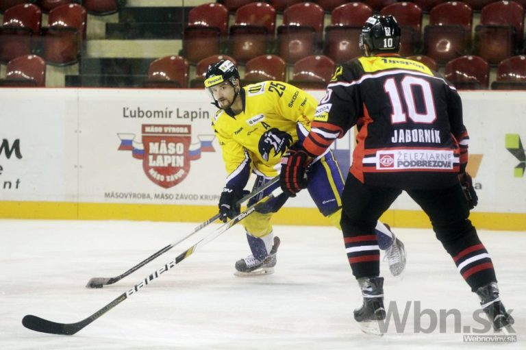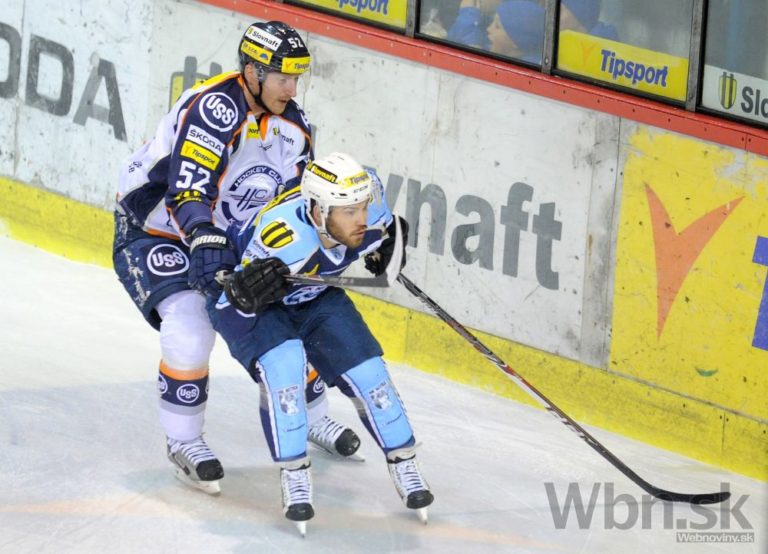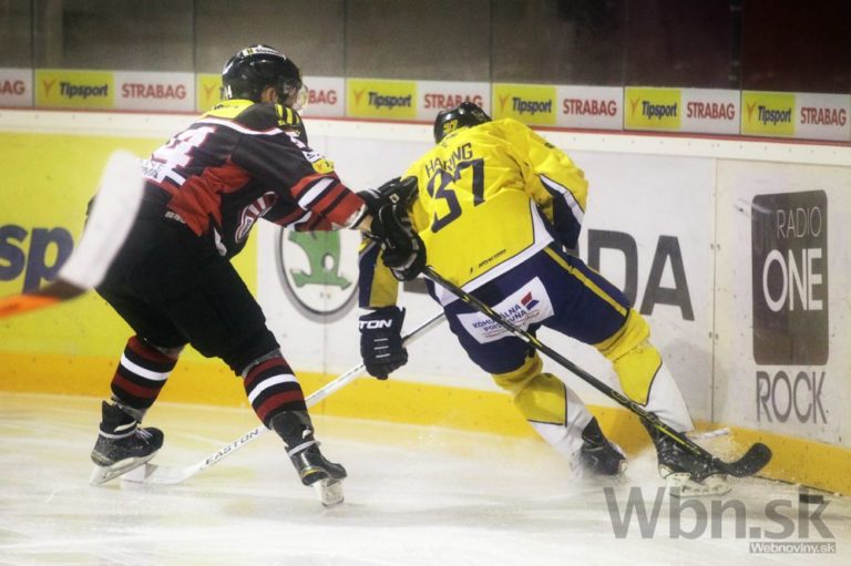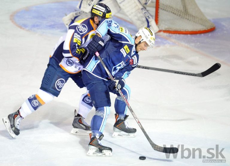 Obranca Banskej Bystrice Mislav Rosandič (vľavo) v súboji s útočníkom ŠHK 37 Piešťany Jozefom Haringom počas zápasu 22. kola Tipsport extraligy. Banská Bystrica, 14. november 2014. Foto: SITA/Ján Viazanička