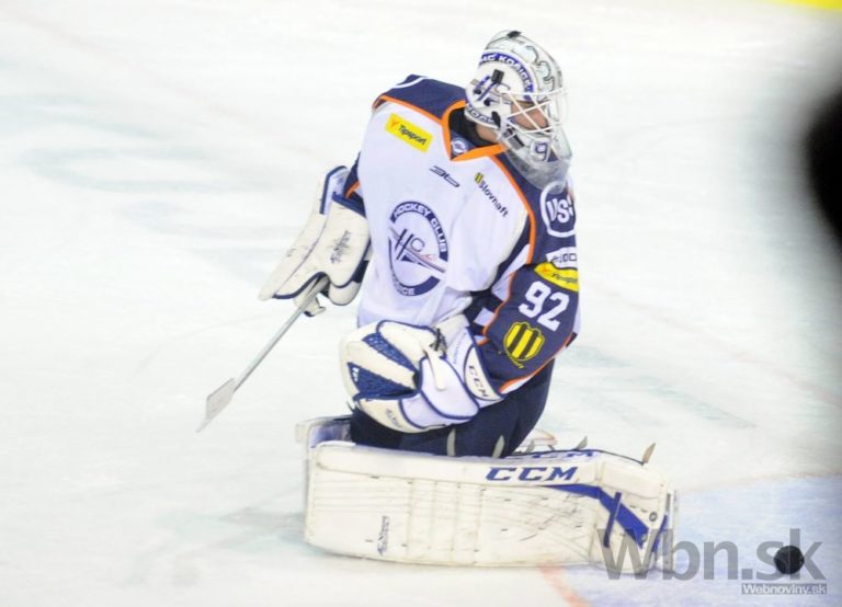 Brankár Marcel Melicherčík z HC Košice vyráža po strele jedného z Nitranov počas zápasu 22. kola Tipsport extraligy. Nitra, 14. november 2014. Foto: SITA/Martin Havran